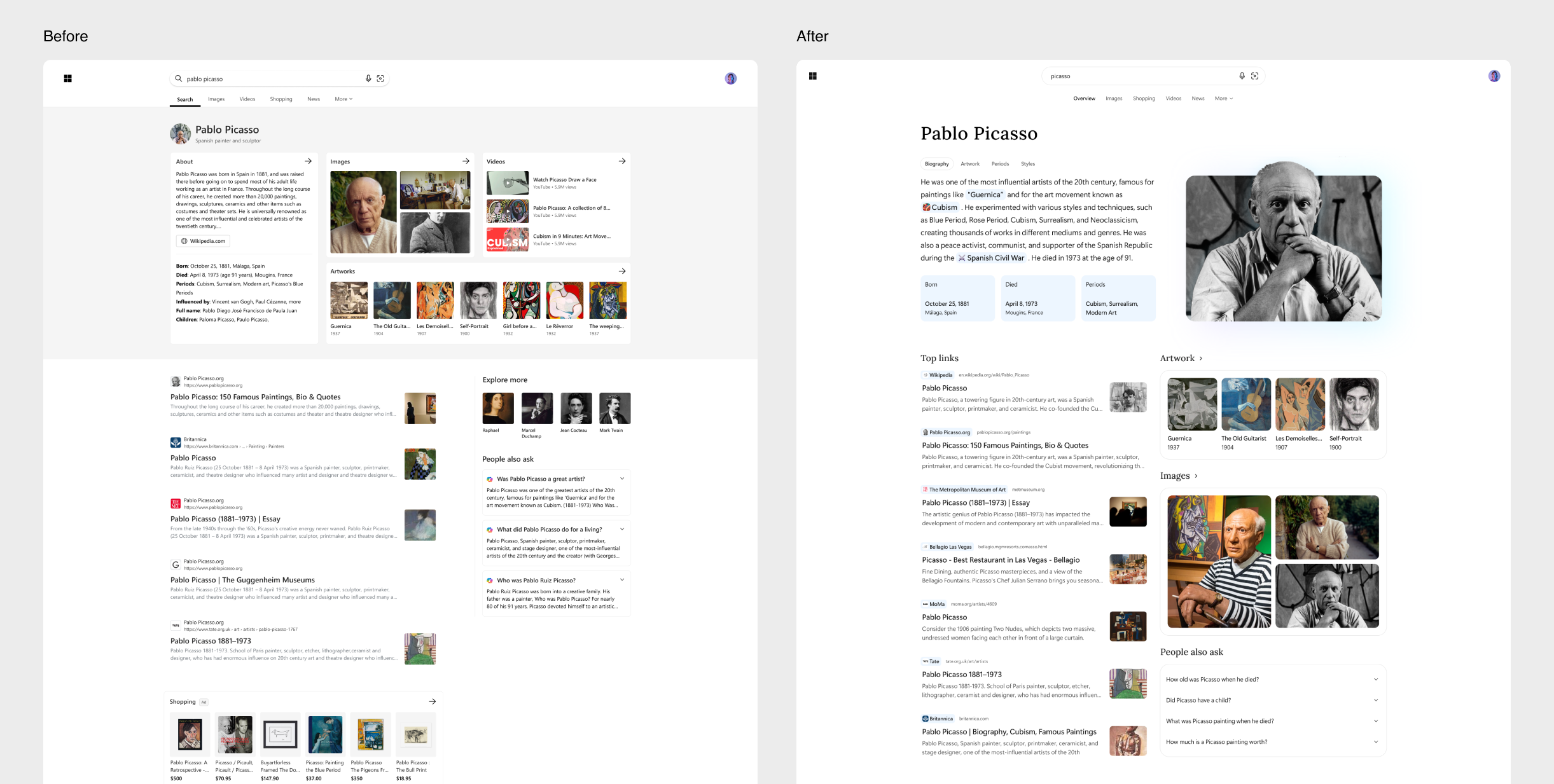 The Bing search results page is owned by multiple teams, which led to a fragmented design system and an overly dense interface. User research revealed that people struggled to focus, felt overwhelmed by the number of elements, and were easily distracted.